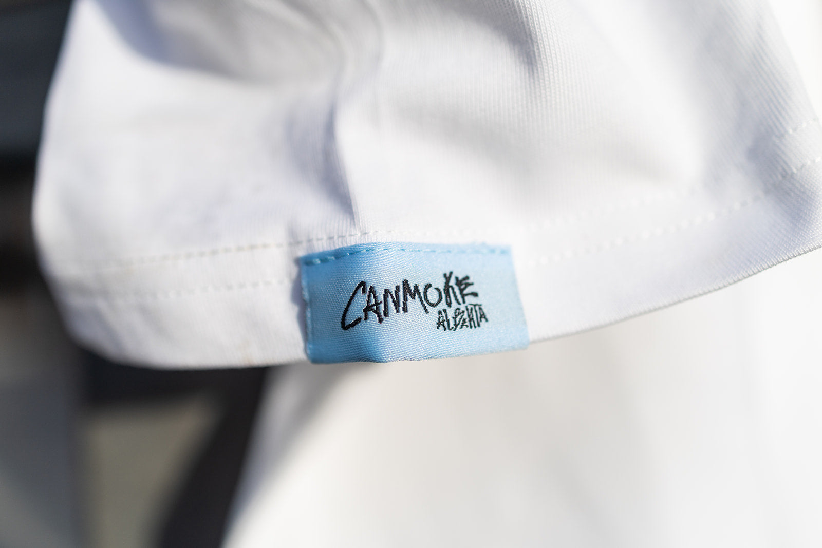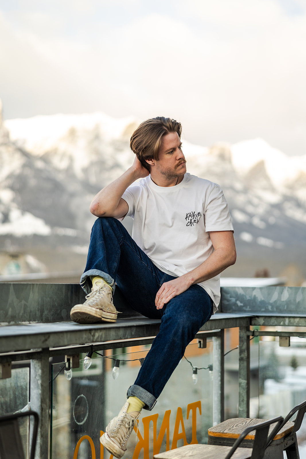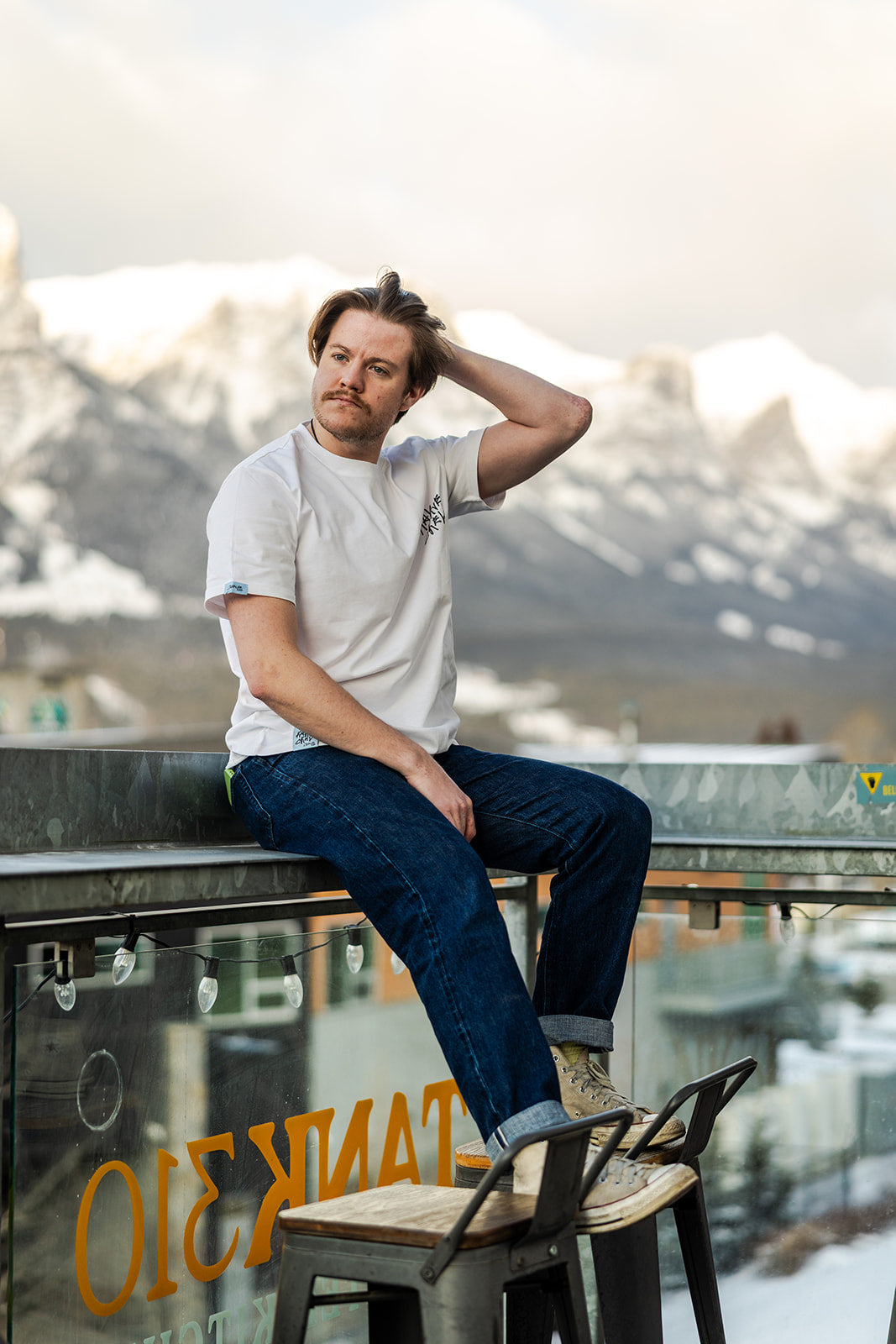 Oversized back graphic framed in a thick blue border, referencing our home in Canmore